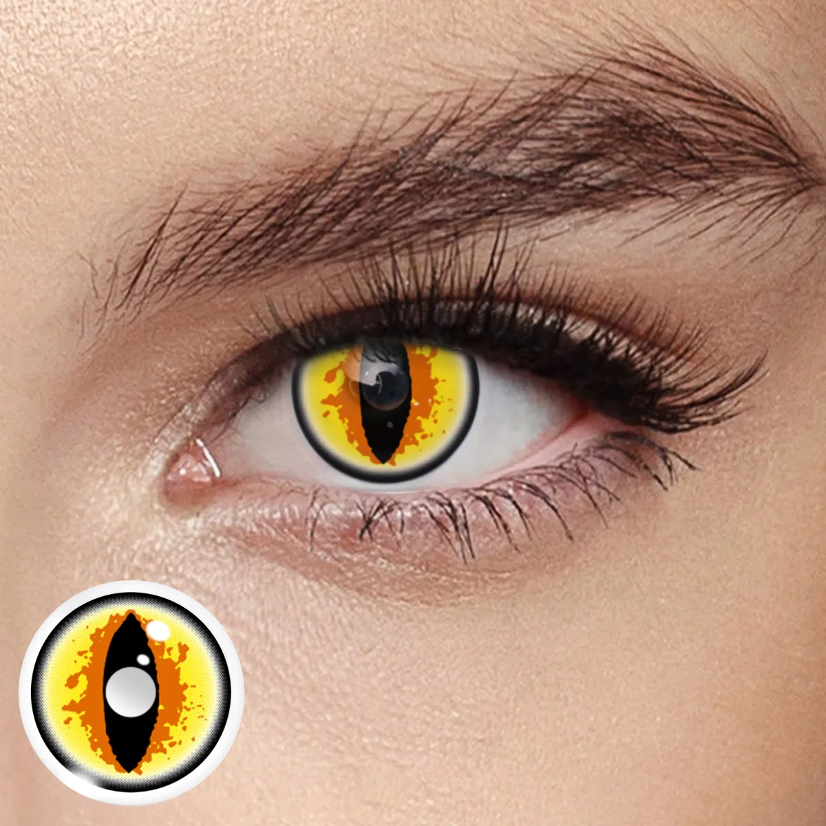 Yellow Cat Eye lenses will turn you into a mesmerizing feline creature. These contacts are among the most dramatic options you can choose to transform your Halloween look. A classic vertical pupil slit stands out against a bright yellow background that creates an instant animal-like appearance. The contrasting elements make your eyes impossible to ignore in any setting. The bright golden-yellow color covers your natural iris completely, so these lenses work well even if you have dark eyes. The color pigments stay locked inside the lens material, which gives you consistent and vivid color that lasts.
